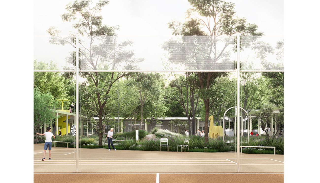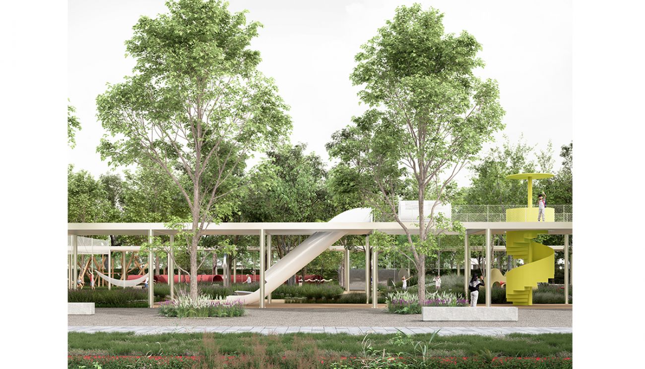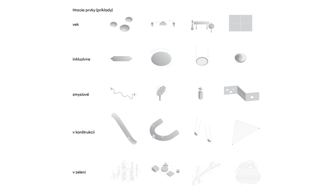 Stavby, ktoré budú miestom pre komunitné centrum a prevádzky s občerstvením - jadro priestoru - sú prepojené multifunkčnou pergolou do ktorej budú vsadené herné prvky a ktorá zároveň ponúka možnosť vertikálneho využitia priestoru. Okolitý priestor je tvorený hernými a oddychovými prvkami pod korunami stromov, ktoré časom ponúknu rozsiahly tieň a príjemnú mikroklímu. V neposlednom rade je areál po celej dĺžke prepojený s promenádou a jazerom.